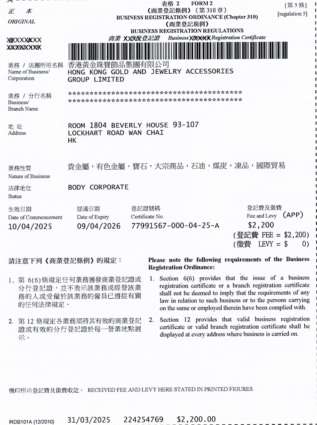 香港黄金珠宝饰品集团有限公司是中矿精诚(北京)科技集团旗下专注黄金产业的专业公司,注册于香港湾仔区。依托母集团在“一带一路”沿线国家掌握的优质金矿资源,结合香港作为国际贸易港的区位优势及全球化设计理念,集团构建了涵盖“开采-加工-销售-服务”于一体的完整产业链,致力于为消费者提供专业品质、高性价比的黄金和珠宝产品,以及尊享服务体验。